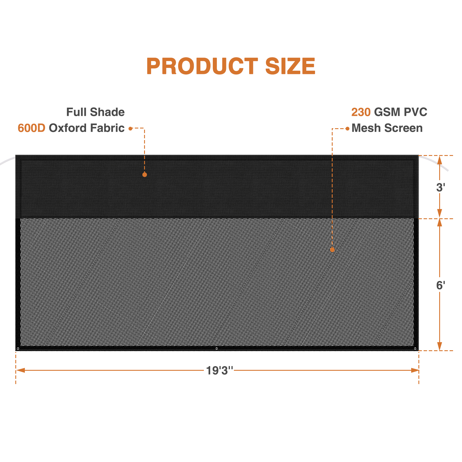 - ✔️【HOW TO SELECT】 Actual fabric dimension is 19′ 3” length by 9’ drop (3 ft top oxford fabric + 6 ft bottom mesh screen), fit for 20 ft-21 ft RV awnings (The RV Awning using Center of Arm to Center of Arm measurement). When select drop size, measure the distance from the awning track to ground. Suitable for most awning brands, such as Dometic (A&E), Carefree, Lippert, Fiamma, Solera, etc.